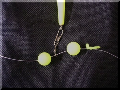 寝ウキの場合、専用のシモリ玉2個ではさむようにセットします。浮力のあるシモリ玉で反応がよくなります。ウキ止めなしのときは必ず付けてください。