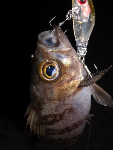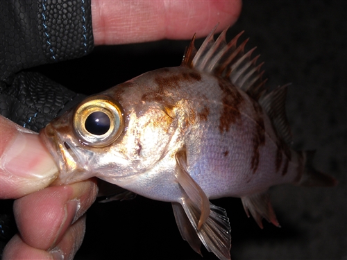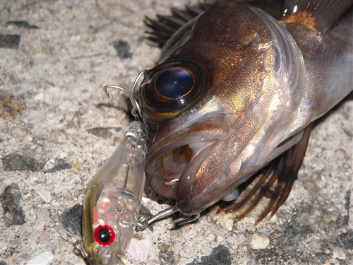シーバスにやられたのか捕食された跡のあるメバル。