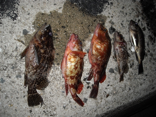 カサゴ 25cmを筆頭に ソイ(ムラソイ?) 20cmはありそうなメバル 画像のほかにも小型ながらメバルを 5,6匹釣っていました。