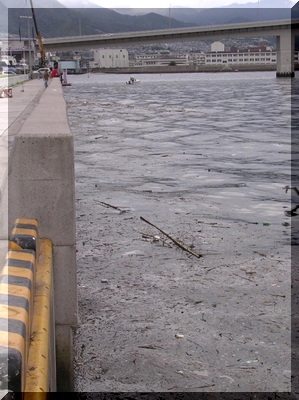 移動したいが、釣友が来ない。(5:30に「起きたか!」と電話してきたくせに・・・。)来れば連絡があるだろうと、カキ打ち場の漁港向きで、1往復、フグのアタリしかない。
